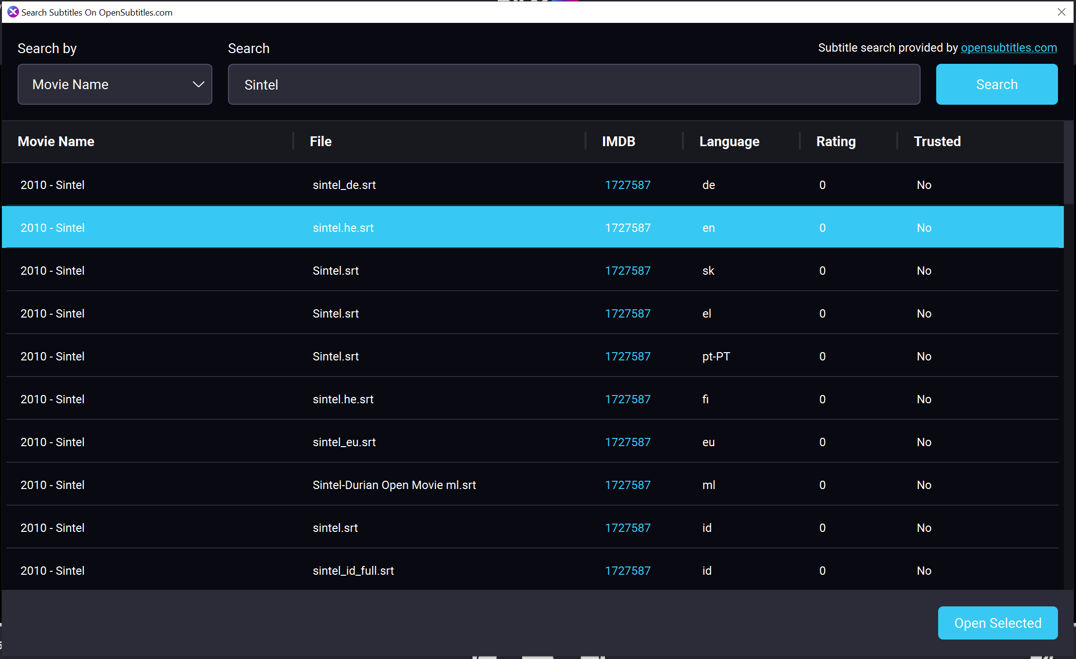 - Look for the correct subtitle in the desired language in the search results. Once found click to highlight the subtitle and then click the 'Open Selected' button