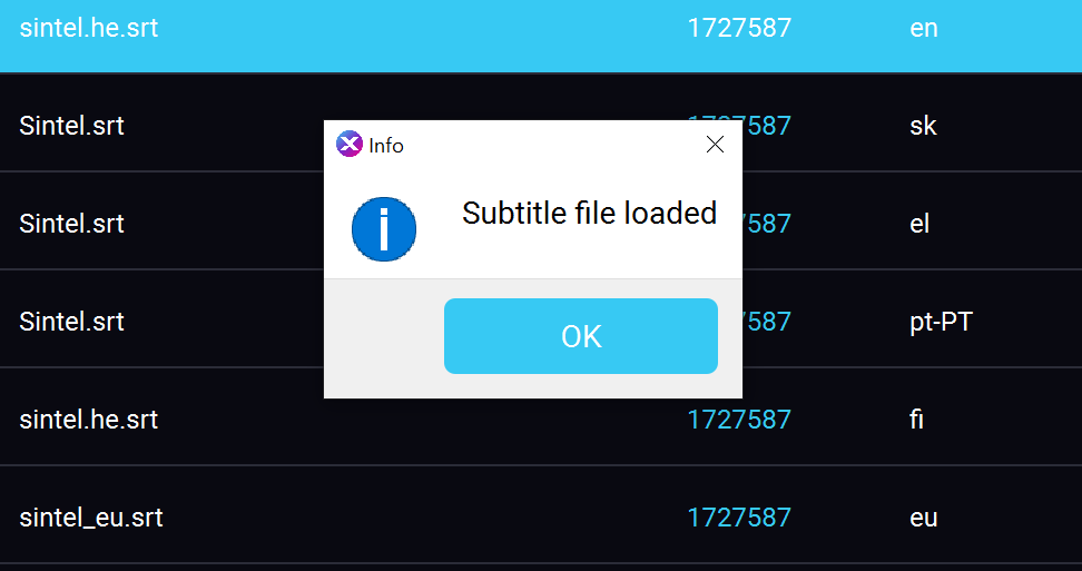 - Your subtitle will now load and display the subtitle file loaded message. Click 'Ok' to clear the message.